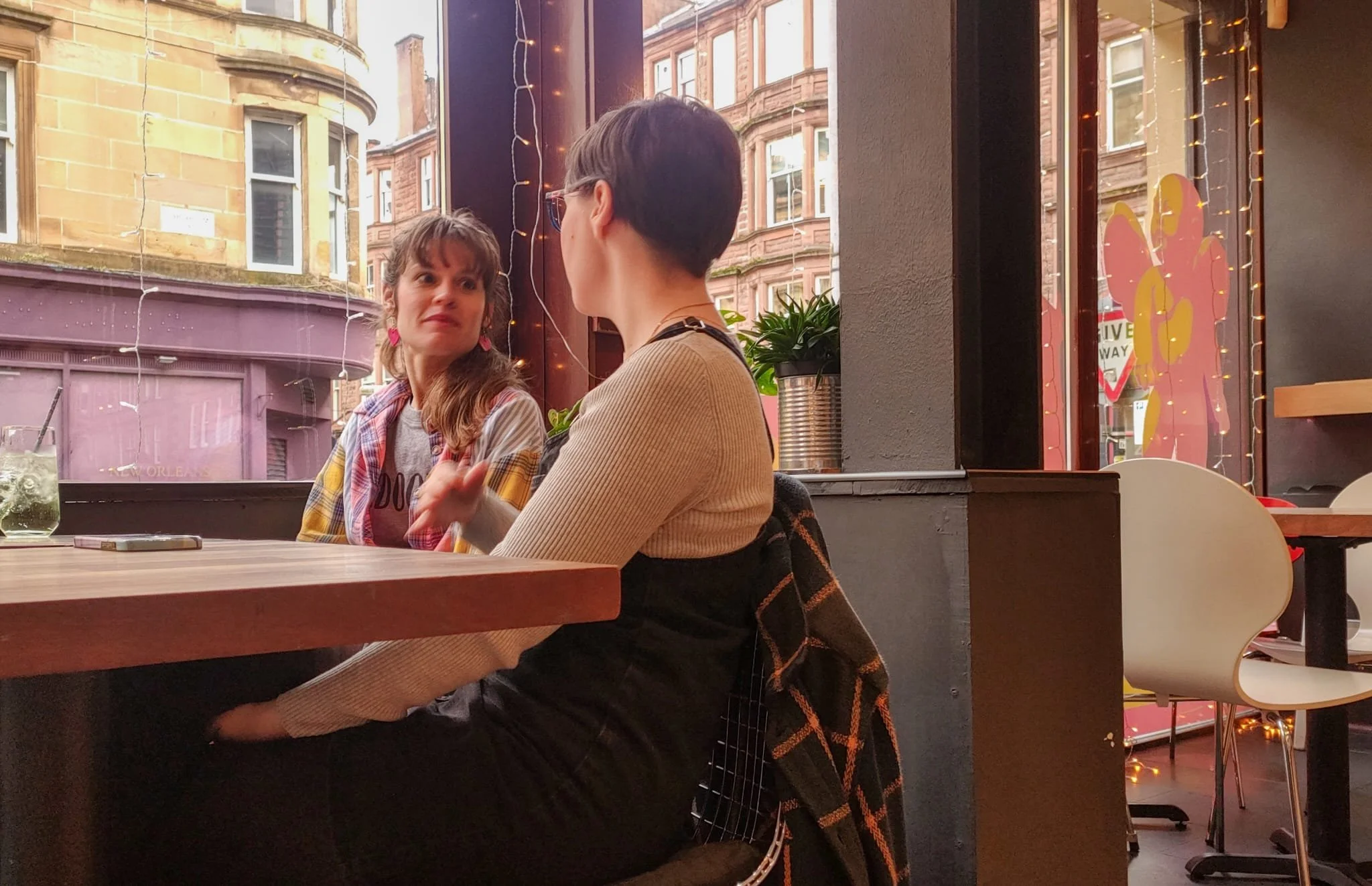 Caption: Lynn sitting with friend really listening with open body language.